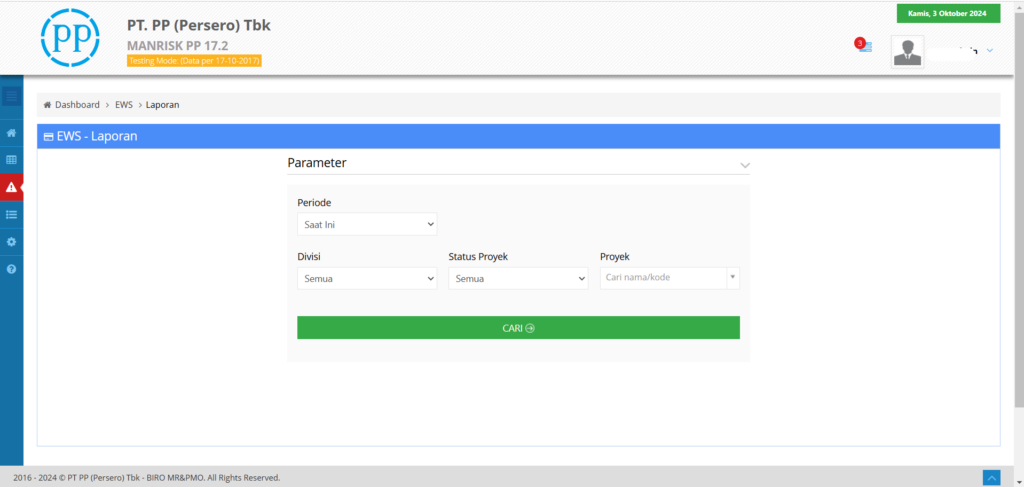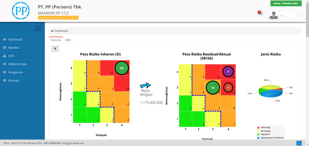 Manrisk PP adalah sistem yang mendukung manajemen risiko administratif yang dirancang untuk PT PP . Sistem ini memungkinkan proses identifikasi, analisis, pemantauan, dan penyampaian laporan risiko dengan mudah dan cepat.
