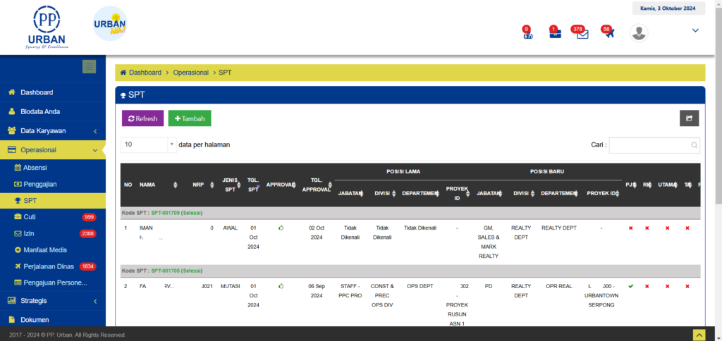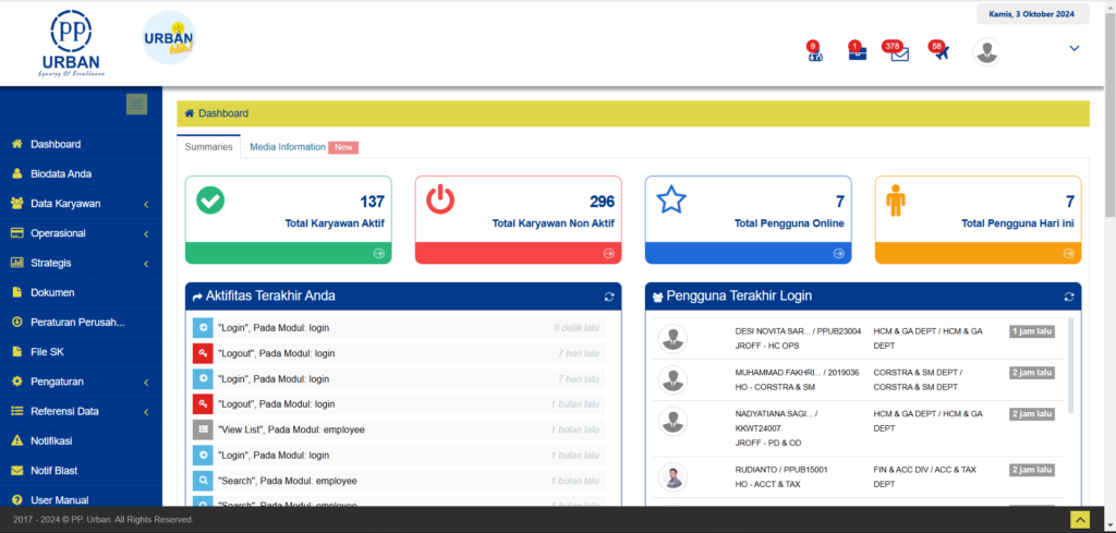 Human Resource Information System (HRIS PP Urban) is an application designed to manage various human resource functions in an organization. The following are some of the main functions of HRIS PP Urban: